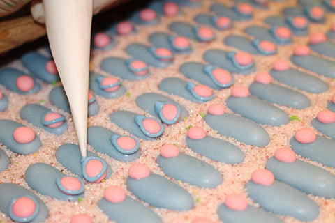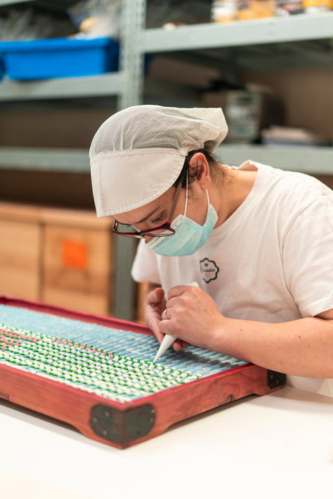 Para além do sabor, o que verdadeiramente distingue as Drageias de Licor Bonjour é o seu processo de produção, marcado por rigor técnico e uma forte componente artesanal. A criação de uma drageia com interior líquido exige precisão em cada etapa. As Drageias Bonjour são um dos ícones da Arcádia, especialmente na Páscoa. O seu processo de confeção é totalmente artesanal e começa com a preparação de uma calda de açúcar, vertida em moldes de amido onde solidifica e forma o núcleo da drageia. Após secagem, as peças passam para bacias de cobre rotativas, onde recebem sucessivas camadas de xarope de açúcar, ganhando volume, textura crocante e um acabamento liso. A fase final é a pintura manual, realizada por uma equipa especializada de bordadeiras, que pintam cada uma delas à mão, dando um aspeto decorativo característico de cada drageia. Sem álcool na sua composição, as Drageias Bonjour mantêm até hoje a técnica e a identidade que as tornaram um símbolo da tradição artesanal da Arcádia. Este momento reforça o posicionamento da marca enquanto casa de tradição, onde o tempo e o cuidado são parte integrante do produto.